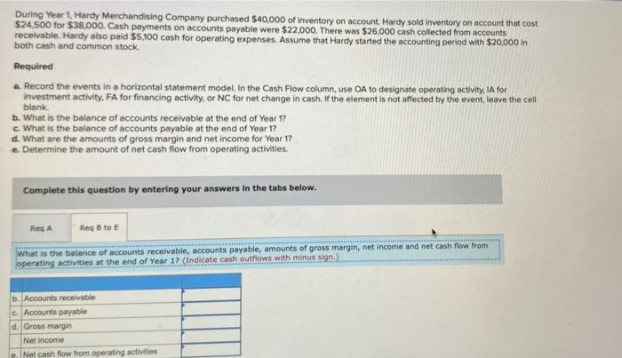 During Year 1 Hardy Merchandising Company purchased 40000 of inventory on account. Hardy sold inventory on account that cost 24500 for 38000. Hardy also paid 5100 cash for operating expenses.